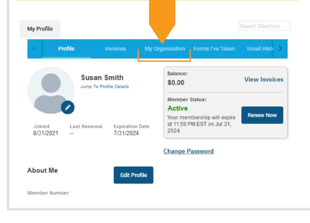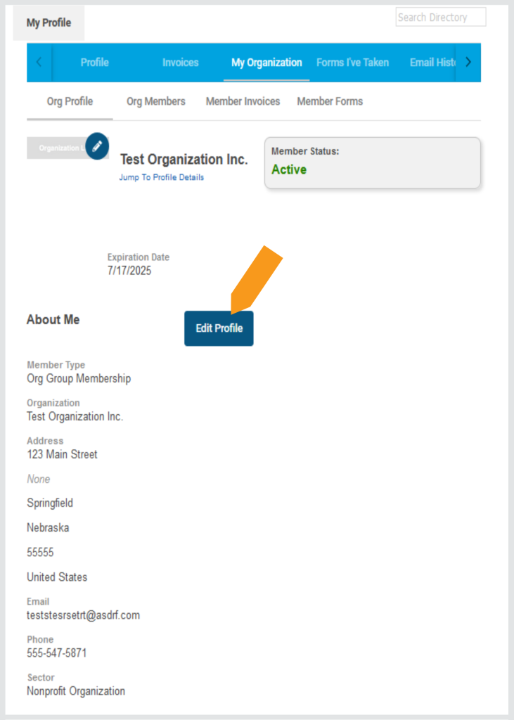 Under My Organization, select Edit Profile to change the billing contact email, phone number or mailing address for your group. These addresses are where renewal invoices will be sent, so it is important to keep them updated.